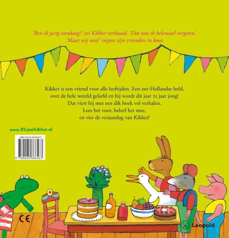 ‘Ben ik vandaag jarig?’ zei Kikker verbaasd. ‘Dat was ik helemaal vergeten.’ ‘Maar wij niet!’ riepen zijn vrienden in koor. Kikker helpt Haas, maar dat pakt niet altijd goed uit. Hij wordt verrast door zijn vrienden. Hij gaat op avontuur met Rat. Hij leert dat iedereen ergens goed in is. Natuurlijk kan hij tellen. Kikker vindt een nieuw vriendje. En hij viert feest. Ja, Kikker boft dat hij een kikker is! Kikker is een vriend voor alle leeftijden. Een oer-Hollandse held, maar over de hele wereld geliefd! Dat viert hij met een dik boek vol verhalen. Lees het voor, beleef het mee, en vier de verjaardag van Kikker!