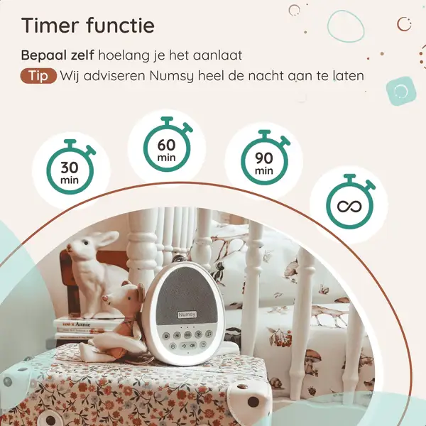 De handige timer kun je instellen op verschillende tijdslots of je kunt ervoor kiezen om continu white noise af te spelen (tot 10 uur). Zo weet je zeker dat jij en je kleine tijdens ieder dutje of iedere nacht heerlijk ontspannen kunnen slapen.