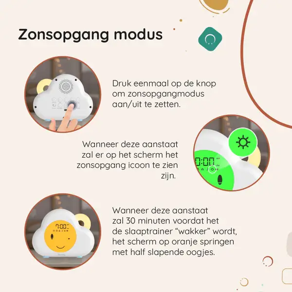 Stel de slaaptijd van je kind in met alarmknop 1 en de wektijd met alarmknop 2. Volg de simpele stappen voor tijdsinstelling en kies uit een reeks rustgevende slaapgeluiden. Wanneer het tijd is om te slapen, wordt het scherm rood met een slaapgezicht. Bij het ontwaken verandert het scherm in een verfrissend groen met open ogen. - Nachtlampje & Zonsopgang Functie: