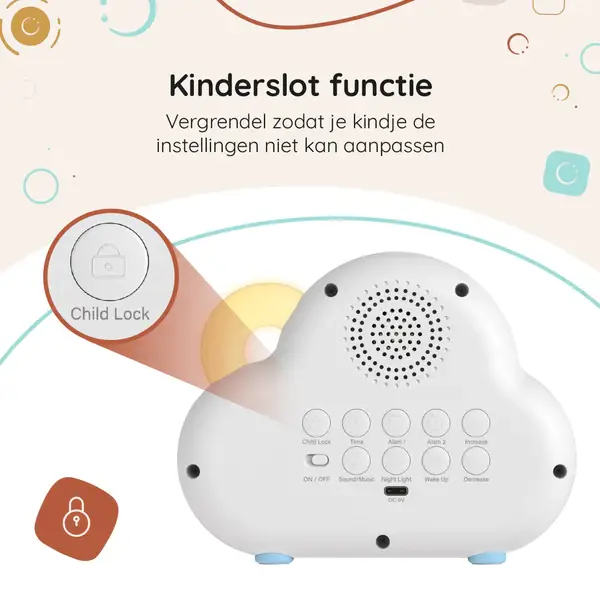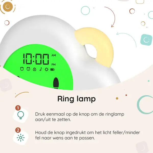 Creëer een comfortabele omgeving met de instelbare ringlamp. De zonsopgang modus helpt je kind voor te bereiden op het ontwaken door 30 minuten voor het alarm zachtjes op te lichten. - Kinderslot & Alarmfuncties: