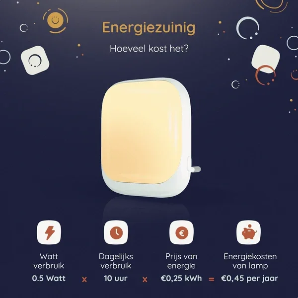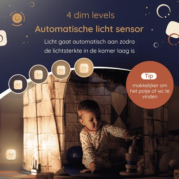 Dankzij de handige lichtsensor past het lampje zijn felheid automatisch aan. Super handig! Want dat maakt dit lampje ook nog eens enorm duurzaam, het verbruik is slechts 0.5W. De Numsy Lux schijnt warm wit licht, wat zacht is voor de ogen. Daarnaast kun je zelf ook de gewenste helderheid van je lampje instellen. Kies uit 1 van de 4 verschillende dim niveaus.