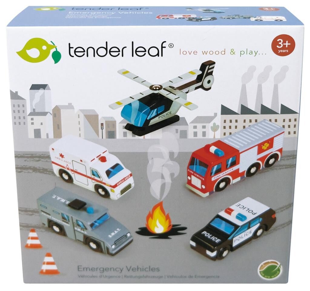 Massief houten voertuigen. Set bestaat uit: helikopter met draaiende bladen, ambulance, brandweerauto, politieauto en S.W.A.T auto.