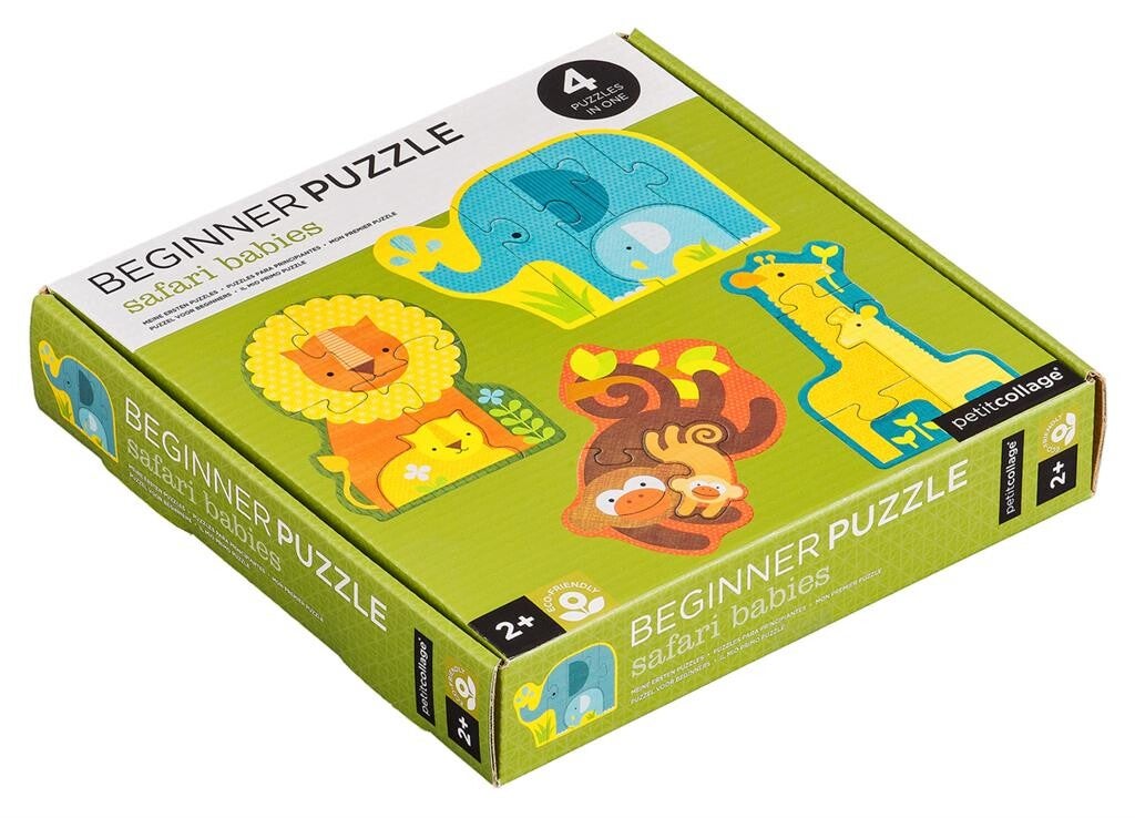In deze stevige doos zitten vier puzzels: met 3, 4, 5 en 6 stukken. Dat wordt steeds moeilijker dus: deze puzzels groeien mee met je kind.