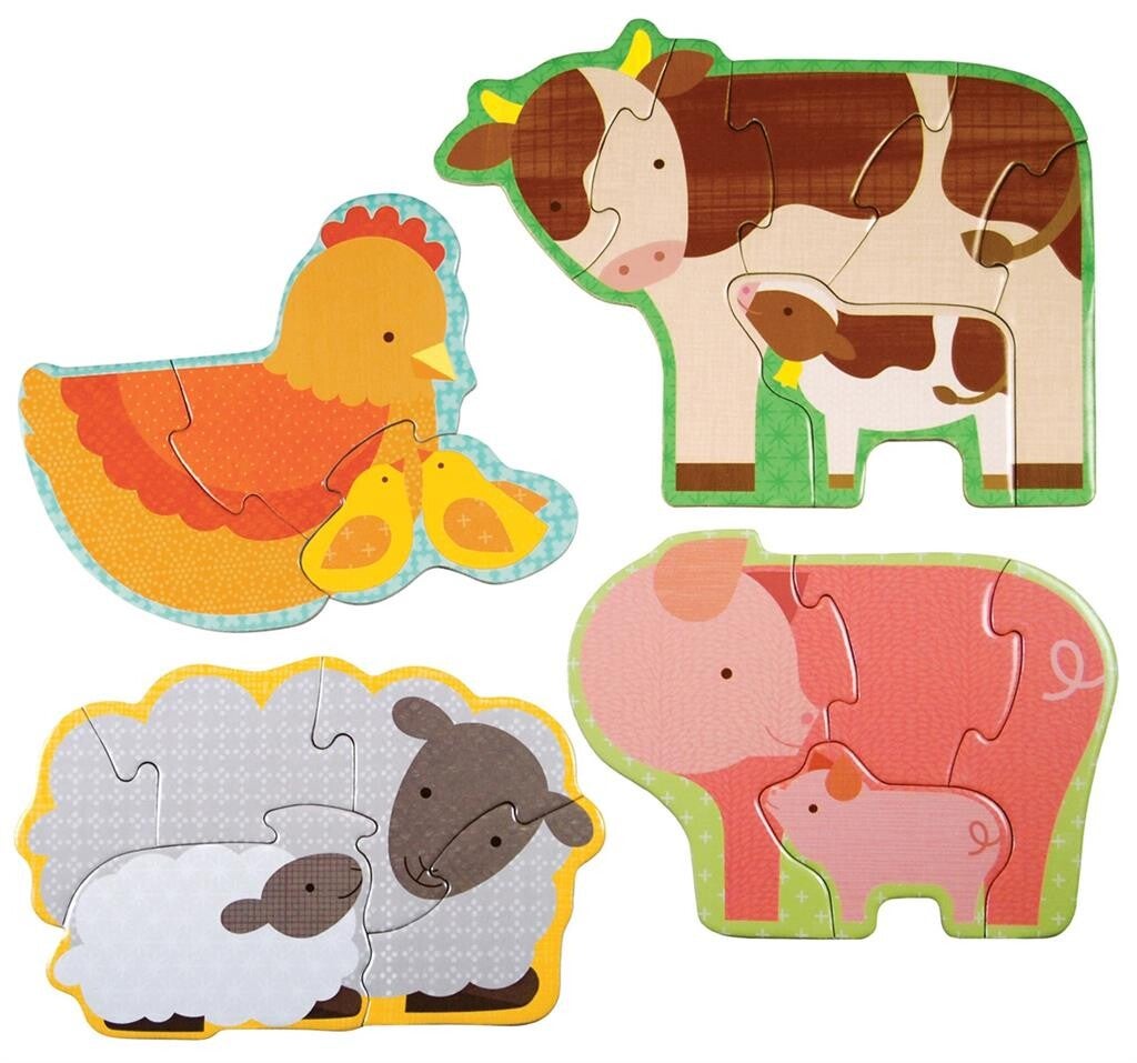 In deze stevige doos zitten vier puzzels: met 3, 4, 5 en 6 stukken. Dat wordt steeds moeilijker dus: deze puzzels groeien mee met je kind.