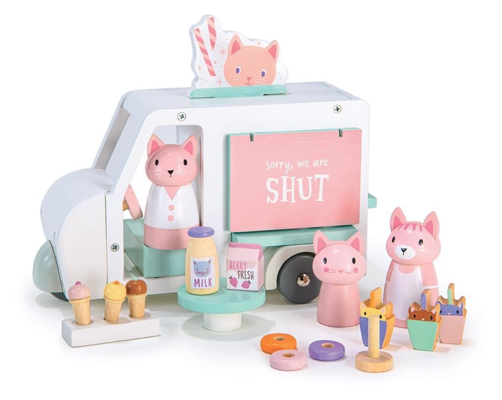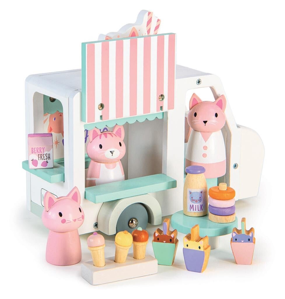 Maak kennis met Kitty en haar hardwerkende gezin! Ze rijden door de stad en serveren heerlijke milkshakes, donuts en ijsjes door de luiken aan alle 3 de kanten van hun witte busje met 3 wielen. Een opklapbare achtergrond maakt het tafereel compleet en zorgt voor meer mogelijkheden om verhalen te vertellen. Goed voor fantasierijk spel. Goed om verhalen te vertellen.