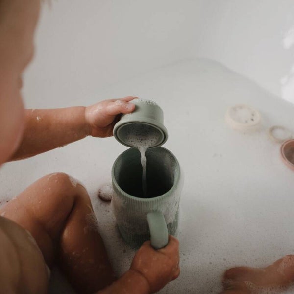 Transformeer je avondroutine met de Mushie Badspoelbeker, ontworpen om schuim en bubbels moeiteloos weg te spoelen.