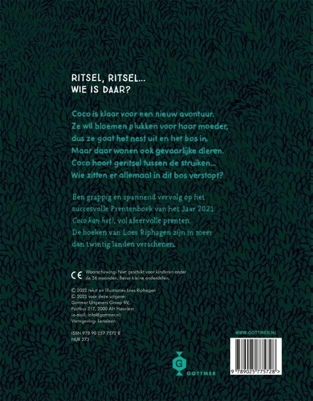 'Coco, kijk uit!' is een betoverend en uniek 3D-boek met veel doorkijk-pagina's van stevig karton. Neem een kijkje in Coco's prachtige groene bos en ga op zoek naar alle dieren die er wonen.In het vervolg op het succesvolle Prentenboek van het Jaar 'Coco kan het!' gaat Coco eropuit om bloemen te plukken voor haar moeder. Verderop zien de bloemen er veel mooier uit dan dicht bij haar nest, dus ze gaat steeds verder het bos in. Maar hier wonen ook gevaarlijke dieren. Dan hoort Coco geritsel tussen de struiken... Wie is daar? Kijk uit voor die poes, Coco! Door de gestanste pagina's en de rijk geïllustreerde platen vol details is 'Coco, kijk uit!' een spannend 3D-boek met veel doorkijkjes. Wie zitten er allemaal in dit prachtige bos verstopt?Loes Riphagen heeft van 'Coco, kijk uit!' en beeldschoon en bijzonder boek gemaakt, met niet alleen de gestanste pagina's maar ook, zoals we van haar gewend zijn, leuke details die het boek keer op keer leuk maken om voor te lezen en te ontdekken.