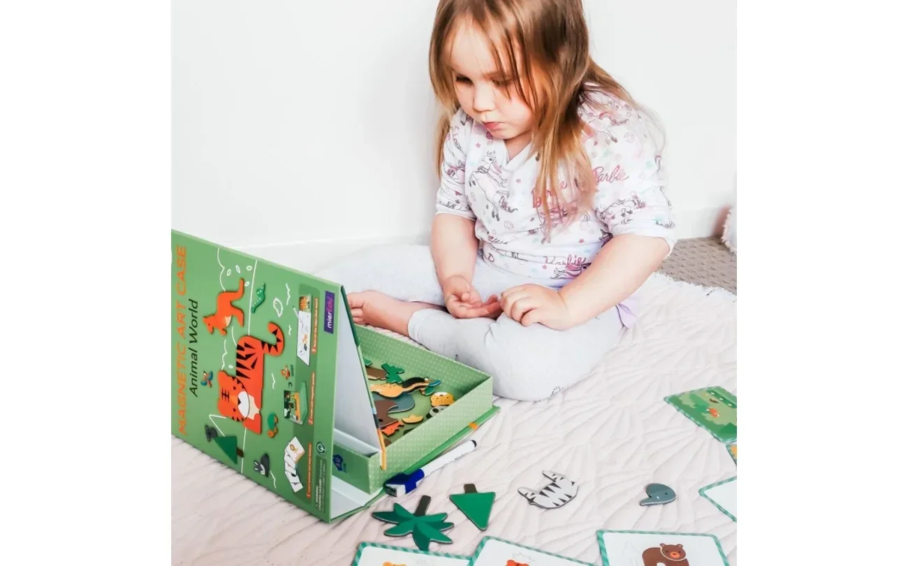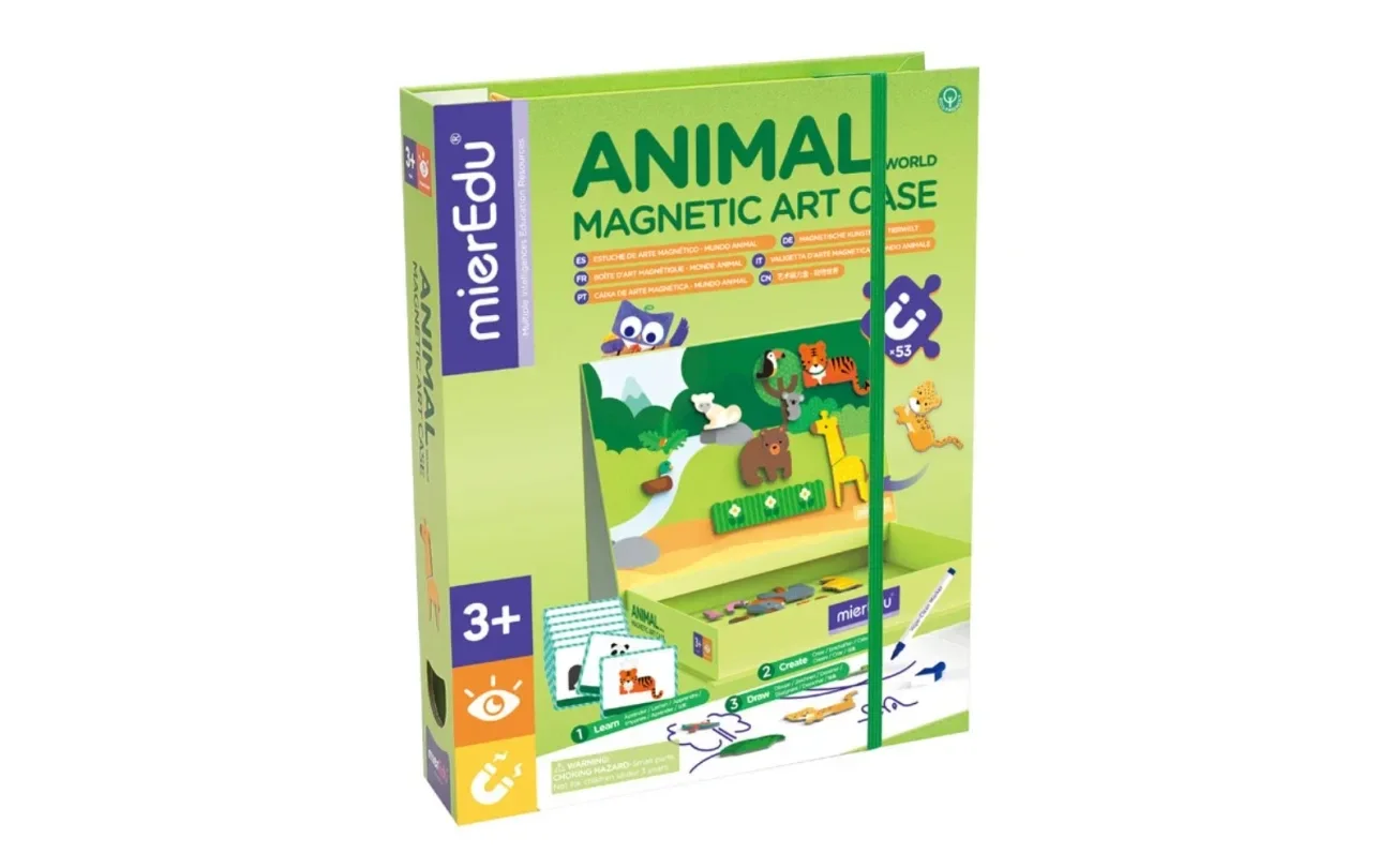 Deze educatieve magnetische puzzelspellen zijn gemakkelijk mee te nemen en leuk om onderweg mee te spelen. Met behulp van magneten kunnen kinderen hun eigen verhalen en afbeeldingen op het bord maken, waardoor hun verbeelding tot leven komt. Samengesteld uit 57 magneten, 8 kaarten en 1 veegviltstift, is dit koffertje handig verpakt en makkelijk mee te nemen. Als de koffer eenmaal open is, kan hij worden omgetoverd tot een groot, schoon te vegen tekenbord, zodat kinderen kunnen tekenen en hun eigen verhalen kunnen maken. Magnetische spellen met kunstkoffers zijn perfect voor het ontwikkelen van creativiteit, tekenen en fijne motoriek.