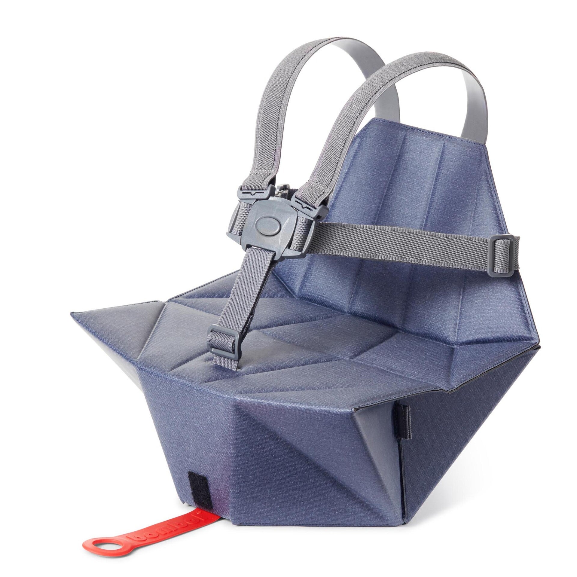 Om de Pop-Up Booster te openen, trek je aan het rode lusje. Hij klikt vanzelf vast in zijn unieke en uiterst stevige driedimensionale origamistructuur. Dankzij deze structuur is de Bombol Pop-Up Booster zeer sterk en veilig en kan hij een gewicht dragen tot wel 75 kg. De veilige 5-puntsharnas is om te vormen tot een 3-puntsharnas naarmate je kindje groeit. Je neemt hem overal eenvoudig mee naartoe, want de stoelverkleiner zelf weegt slechts 950 gram.